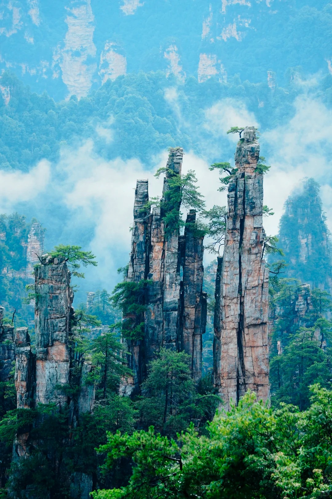 在中国,没有哪座山岳像武陵源这样,让人同时感到“震撼”与“困惑”。 震撼的是那3103座石英砂岩峰柱,如刀削斧劈般拔地而起,浩浩荡荡铺展到天际;困惑的是,你分明站在山顶,却仿佛置身于一片“石头的森林”,每根石柱都像一株远古巨树的化石,沉默地矗立着。美国电影《阿凡达》的导